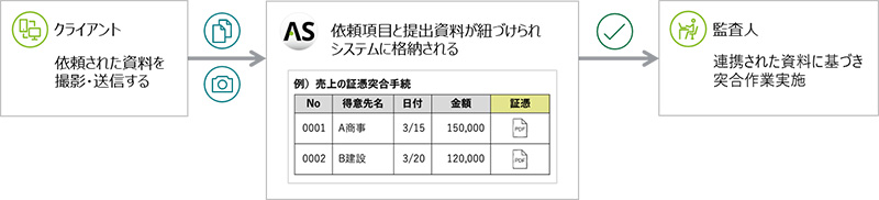 監査の過程で行われる大量の資料のやり取りを効率的に行うためのコミュニケーションツールです。デジタルデータに加え、紙の資料をスマートフォンアプリで撮影し、PDFファイルとして依頼項目に紐付けて格納することができます。さらに、チャット機能や期限のリマインド機能を備えており、監査業務の効率化を支援します。