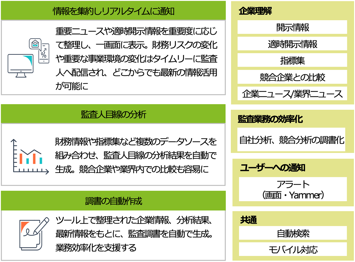 外部情報(開示情報、ニュース、業界レポート等)と内部情報(監査や品質管理において生成する情報)を統合した情報基盤です。リアルタイムな情報収集やリスク評価を実施し、監査時間の大幅削減を実現します。