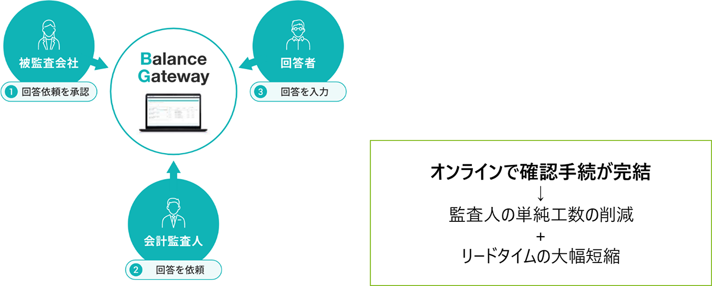 「Balance Gateway®」は、監査業界で共通活用されている残高確認オンラインサービスです。紙を何度も郵送する手間と時間を大幅に削減でき、Web上での情報伝達や手続状況の視覚化など多くのメリットがあり、監査先企業、確認回答者、トーマツの3者がスピーディに手続きを進めることが可能になりました。
