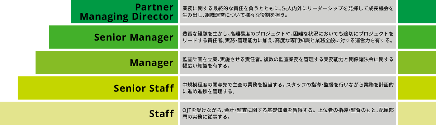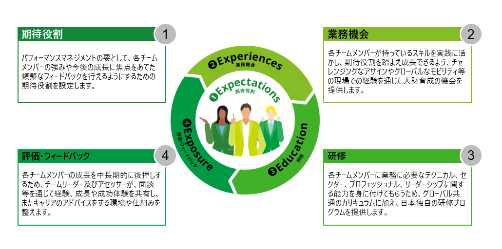 高品質な業務を提供し続けるために、社員・職員に明確な期待役割を設定し、監査の現場や研修で技量・能力を磨く機会を提供しています。また、上位者やアセッサーとの面談や頻繁なフィードバックを通じて、個々の成長を促進しています。