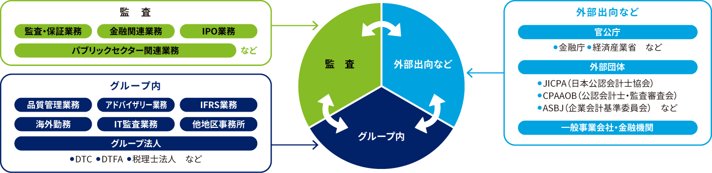 また、Deloitte Globalと協働して研修を開発するなど、世界各国のメンバーファームと人財の相互交流を行うことによって、グローバルでのサービス提供を可能にする体制を整えています。各国で得た知識やネットワーク・異文化での業務経験を日本の実務で生かすための仕組みづくりも推進しています。