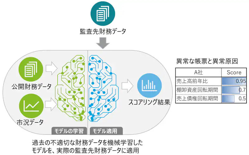 「不正検知モデル」は、上場企業等の過去の不適切な財務データをAI・機械学習モデルに学習させることにより、会社・勘定科目等単位で不正の兆候検知を可能にするものです。監査人は監査先から財務データを入手し、不正検知モデルにデータを投入することで、当該モデルによる不正リスクスコアの計算が実施され、不正リスクが高い会社、勘定科目及び財務指標等を識別することができます。これにより監査人は不正リスクの分析を効率的に行うとともに、検知された不正の兆候に基づいて監査先企業との議論をより深化させることで、企業の内部統制やガバナンス向上に貢献します。