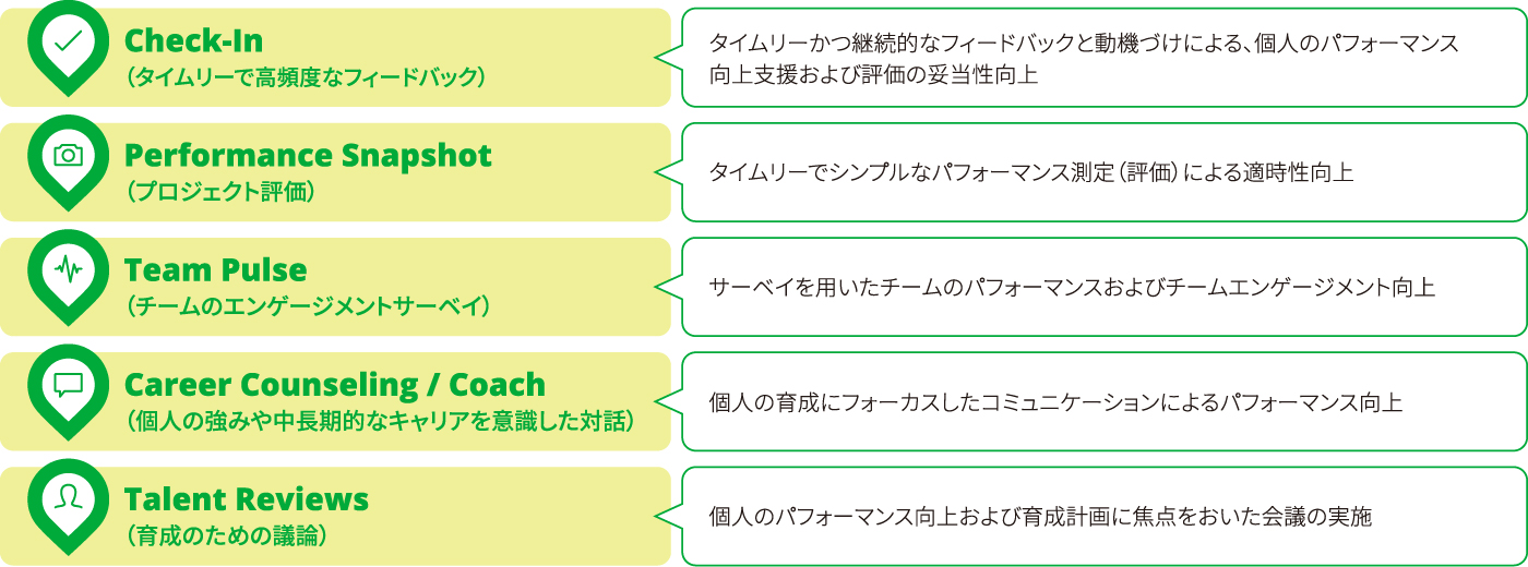 グローバルと共通のツールを5つ用いて「継続的なフィードバック」「適時のパフォーマンス確認」を行うことで、一人ひとりの日々の成長をバックアップします。